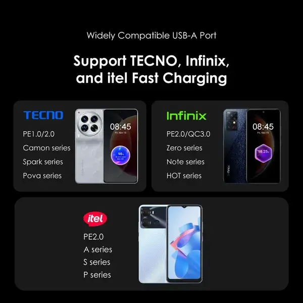 Powered by oraimo AniFast™ Technology, it is compatible with multiple devices including Apple, Samsung, TECNO, Infinix, Xiaomi, HUAWEI, and more.
