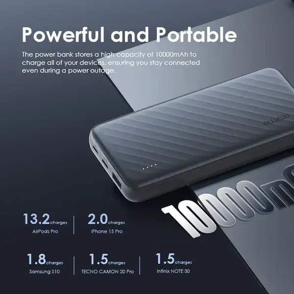 The power bank stores a high capacity of 10000mAh to charge all of your devices, ensuring you stay connected even during a power outage.