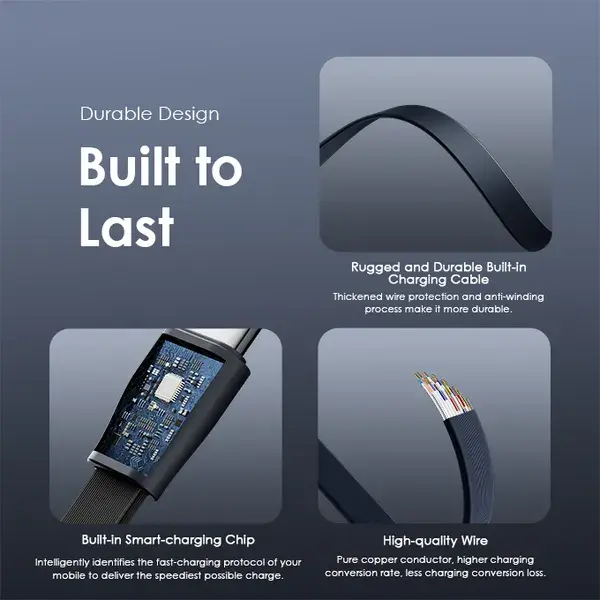 Thickened wire protection and anti-winding process make it more durable. Built-in Smart-charging Chip Intelligently identifies the fast-charging protocol of your mobile to deliver the speediest possible charge. High-quality Wire Pure copper conductor, higher charging conversion rate, less charging conversion loss.